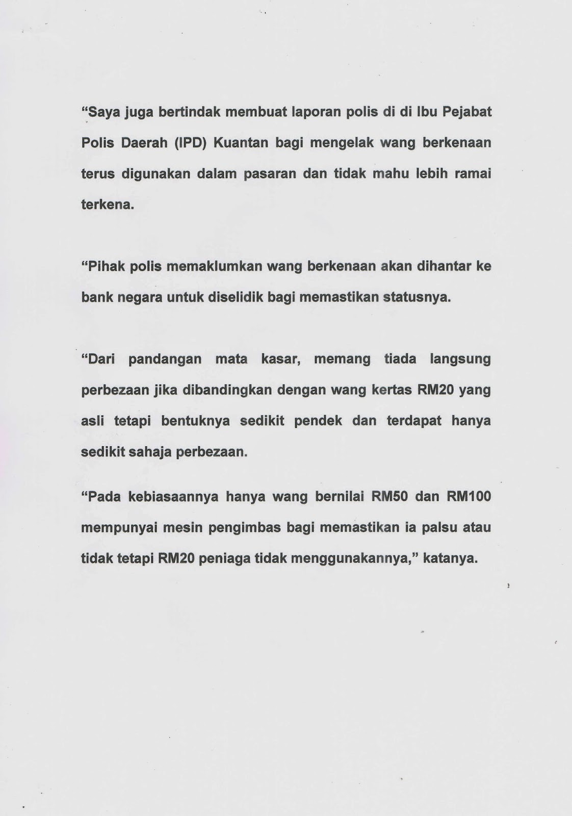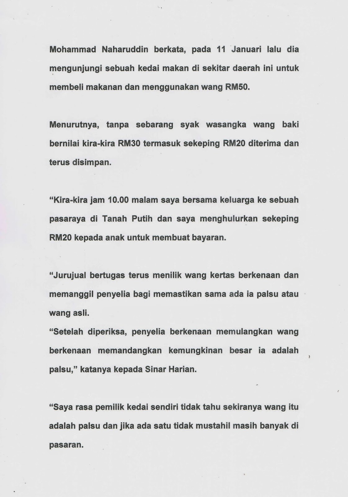 “Saya terkejut apabila jurujual sebuah pasar raya mendakwa wang kertas not RM50 yang saya gunakan untuk membayar barangan yang dibeli adalah wang palsu.