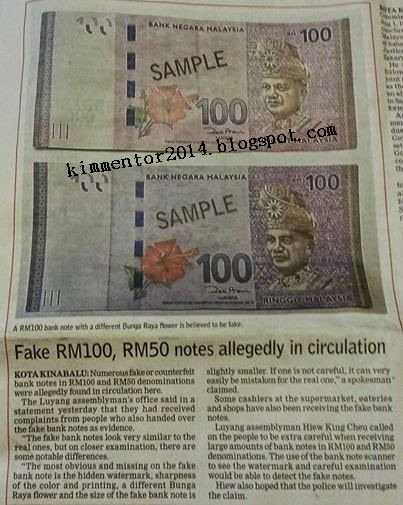 Awas! jika anda berurusan dengan seseorang menggunakan wang kertas RM100, anda perlu berhati-hati kerana ada kemungkinan wang tersebut palsu.