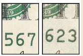 On a genuine bill, the saw-tooth points of the Federal Reserve and Treasury seals are clear, distinct, and sharp. The counterfeit seals may have uneven, blunt, or broken saw-tooth points.